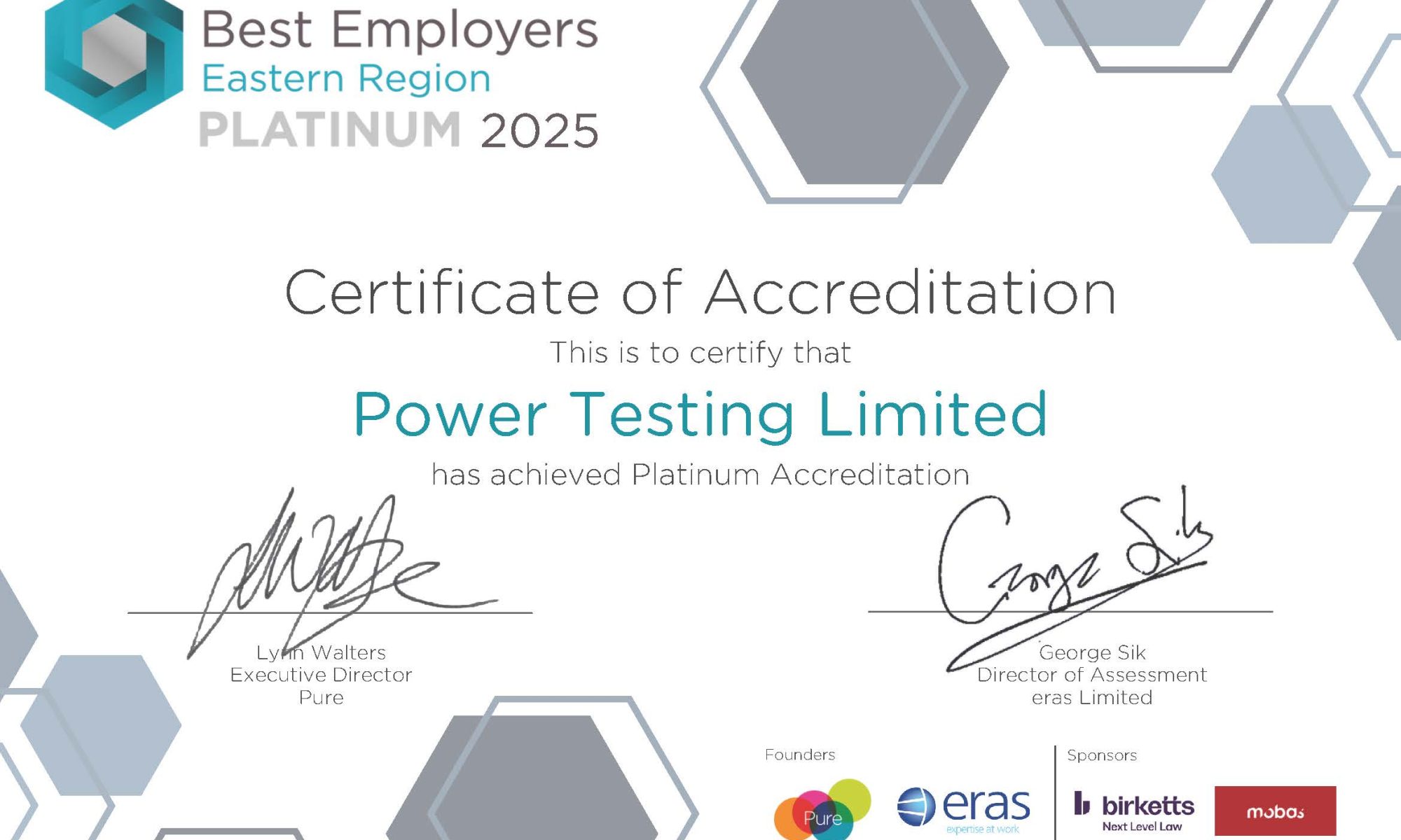 Weโre proud to announce that Power Testing Limited has achieved Platinum Accreditation from Best Employers 2025!